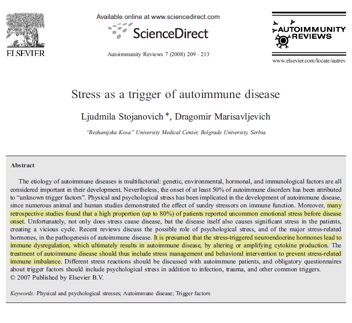 정신적인 스트레스는 신경 내분비 호르몬을 통해서(HPA axis) 면역계의 조절 기능 이상을 유발하고, 이는 cytokines의 밸런스를 무너트리게 되어 결국 자가면역질환이 발생하게 됩니다.