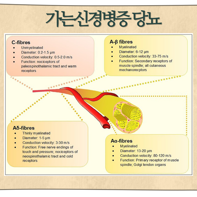 당뇨로 인한 신경병증(DPN) 중 **원위부 다발신경병증(DSPN)**은 전체 당뇨 환자의 75%에서 발생한다는 보고가 있습니다. 유사한 병리로 소섬유 신경병증이 발생하며, 이 신경은 전체 말초 신경의 80-90%를 차지합니다.