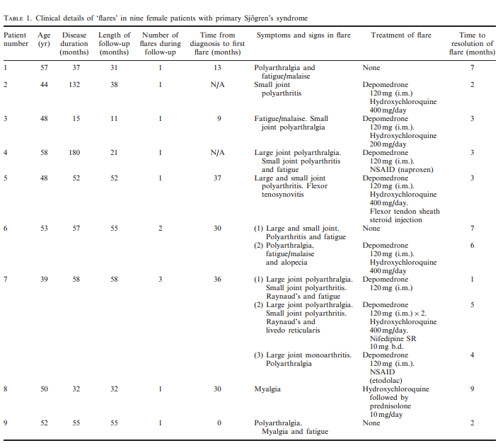 2005년 영국에서 나온 letter에서는 53명의 쇼그렌증후군 환자들의 전신성 증상(Fllare) 가 어느 정도로 발생하는지 분석해보았습니다.